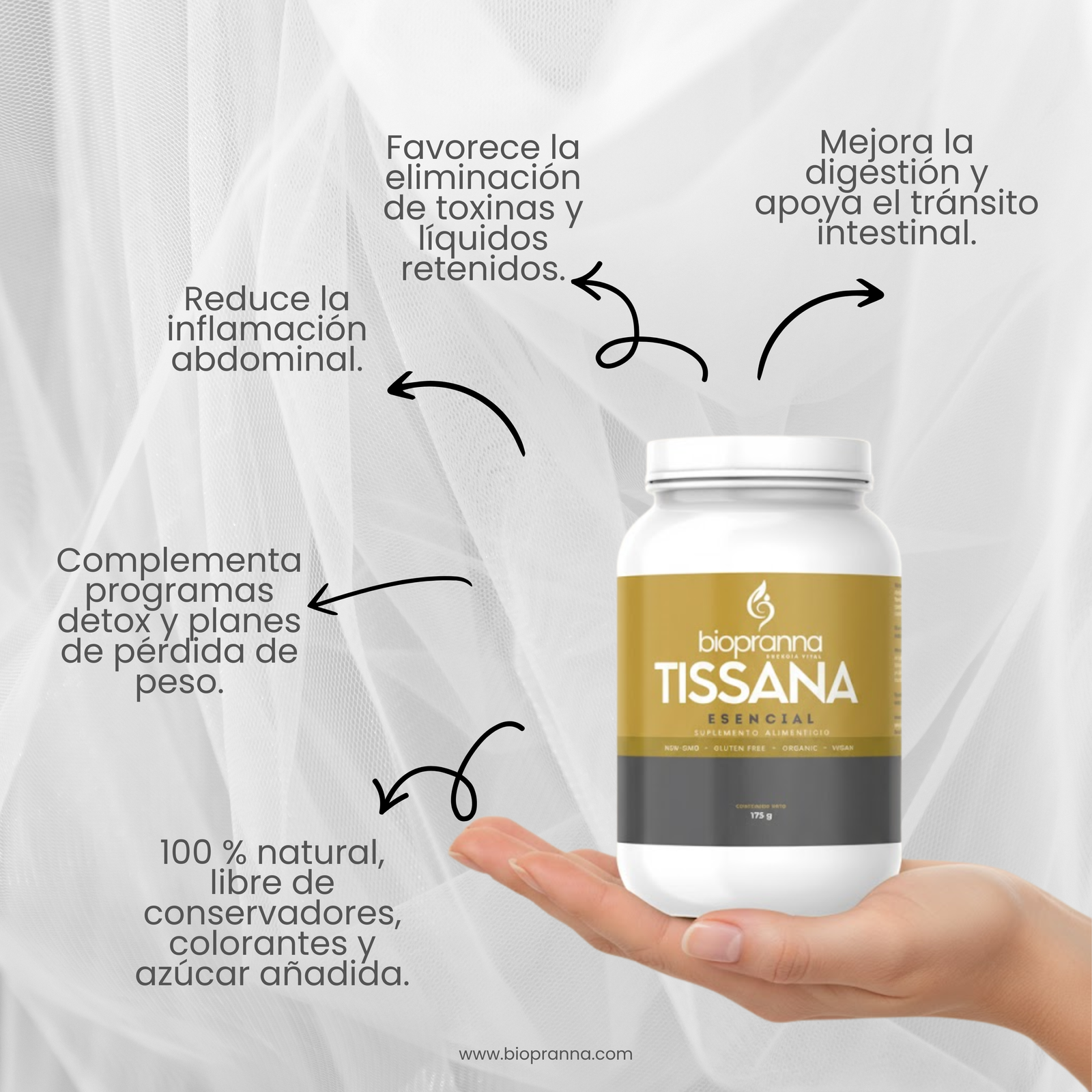 Tissana Esencial de biopranna es una mezcla natural cuidadosamente formulada para apoyar la depuración del organismo, mejorar la digestión y favorecer la pérdida de peso de forma natural y segura.
